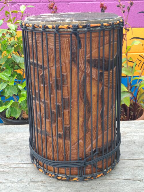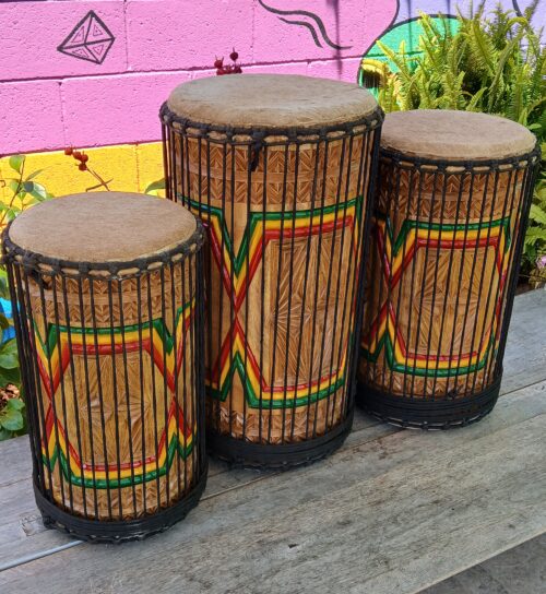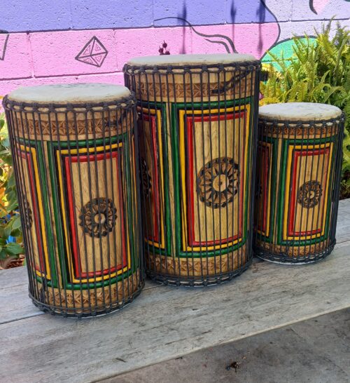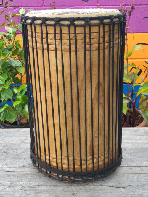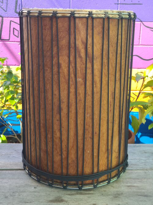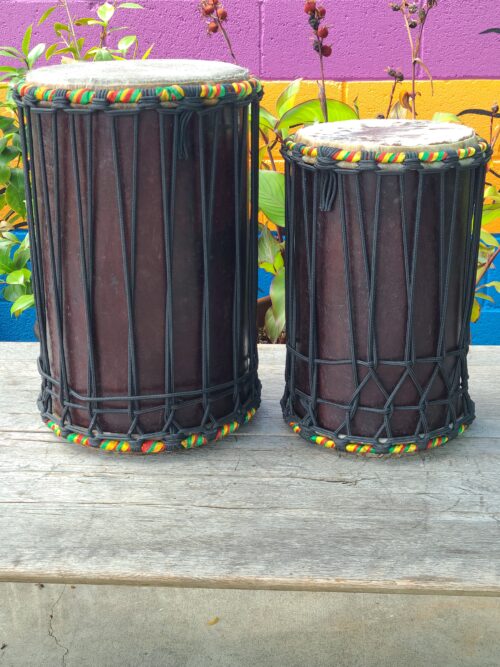 Dunduns provide a melodic bass rhythm, the foundation for dancers, vocals, and other instrumentation and syncs the many to one. A single dundun played is the heart beat, the steady time keeper, when played in sets of two or three they are pitched high, medium, and low. Motherland dunduns are made in several regions of West Africa using either from lighter or heavier type woods. Dunduns can be fixed with thick cowhide or thinner goat skin, both skin types can produce resonate bass tones.