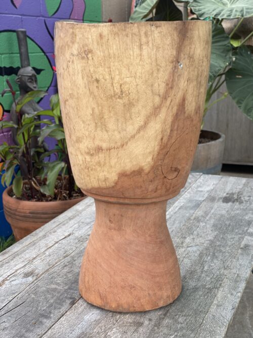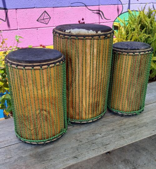 An Iroko wood shell with a thick cow skin on one side of the drum gives a very unique and clean sound. A new and different version of the traditional three drum set. Each drum comes with a durable and custom metal stand. The height of each drum on the stand is 32 inches tall.