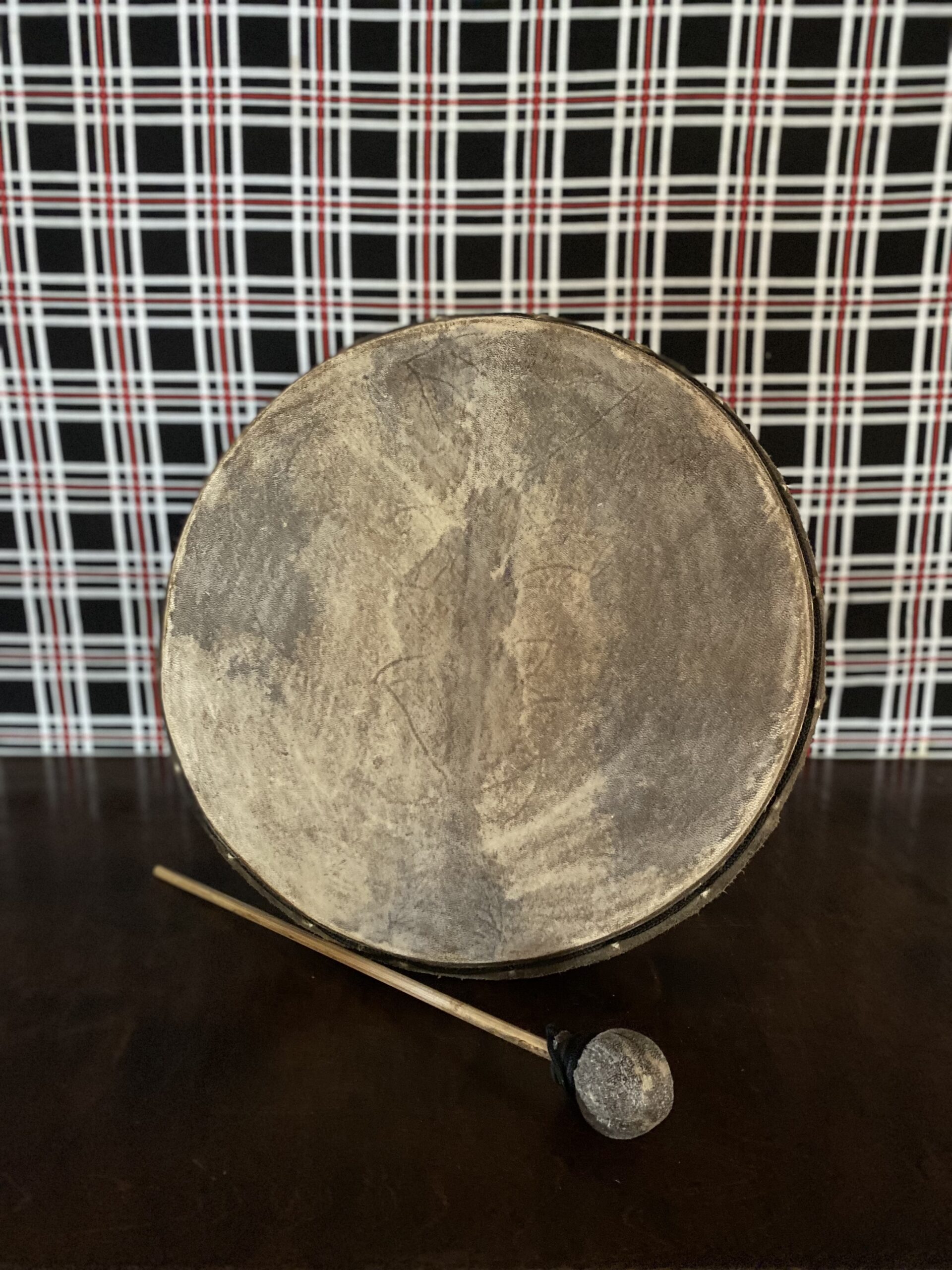 With a beautiful goat skin, this drum is played with sticks. The skin is tuneable with rope and easy to adjust to a desired pitch. This type of drum is very popular in all types of ceremonies cause provides a real nice low vibration pitch and its easy to carry while dancing or performing.
