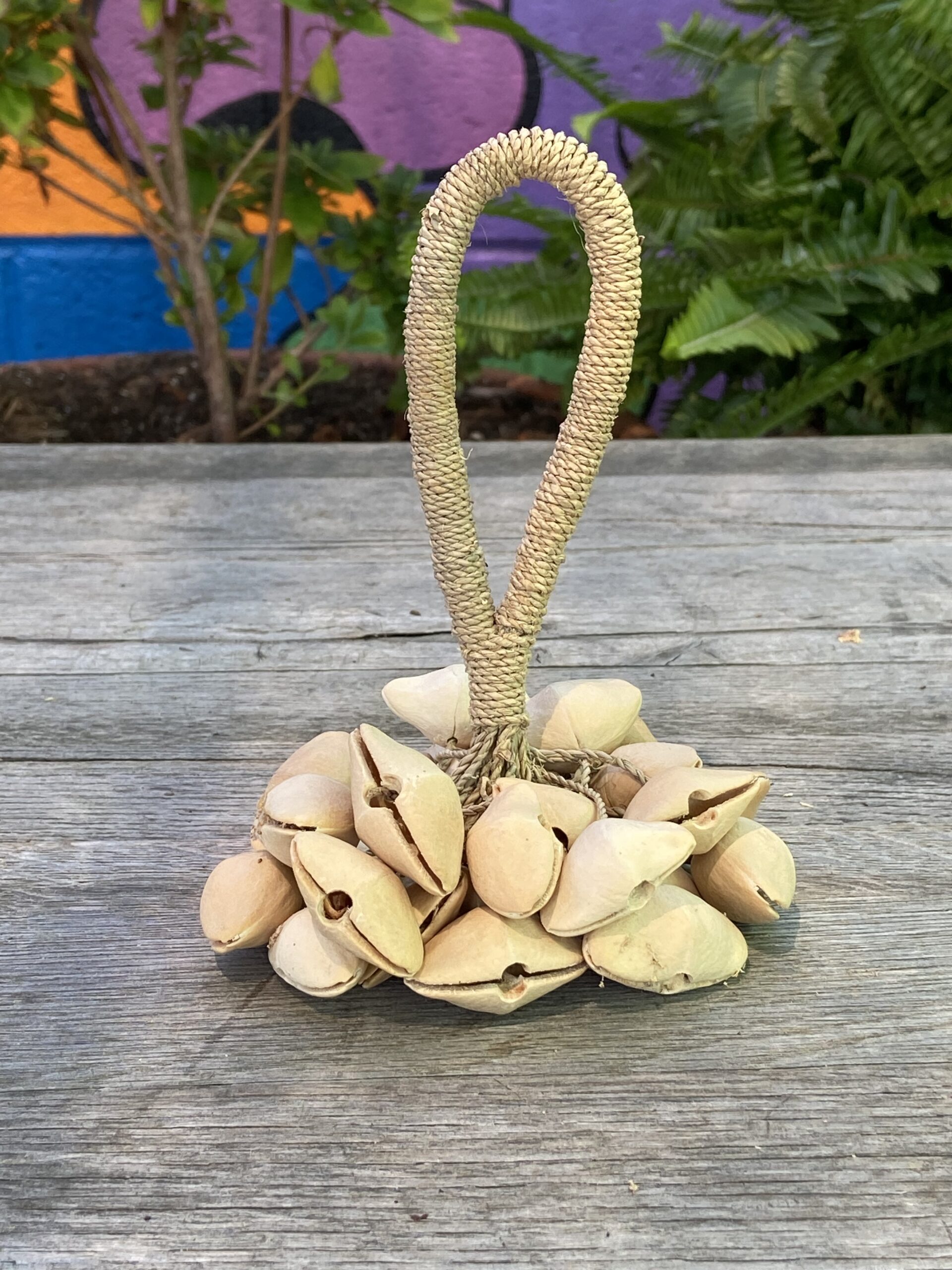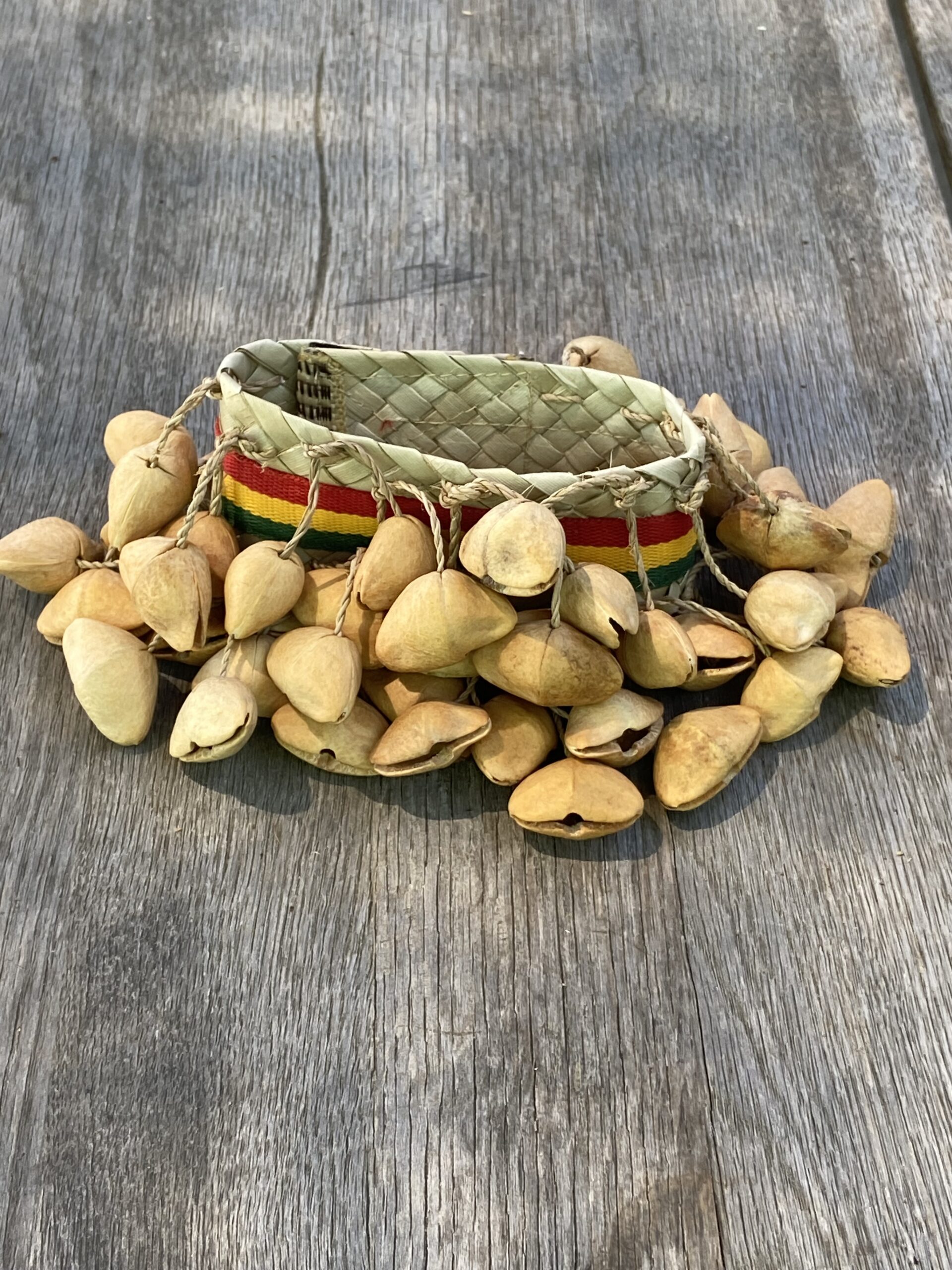 Kenari shakers and rattles are available in five configurations; made either for wearing as a wristlet, anklet or a long fiber belt, or hand held with seeds attached to a wood stick, or grouped in a bunch with a string loop handle.