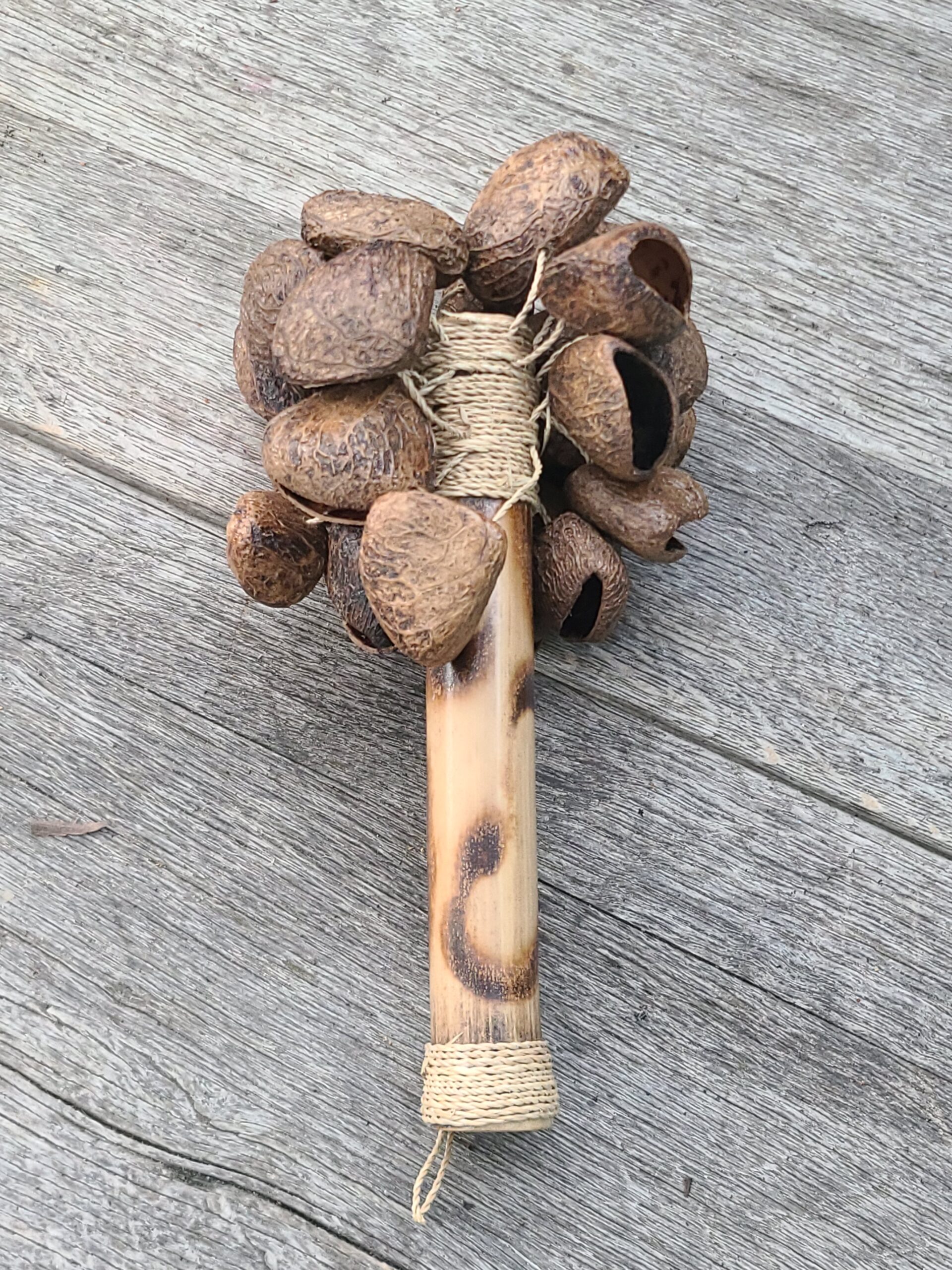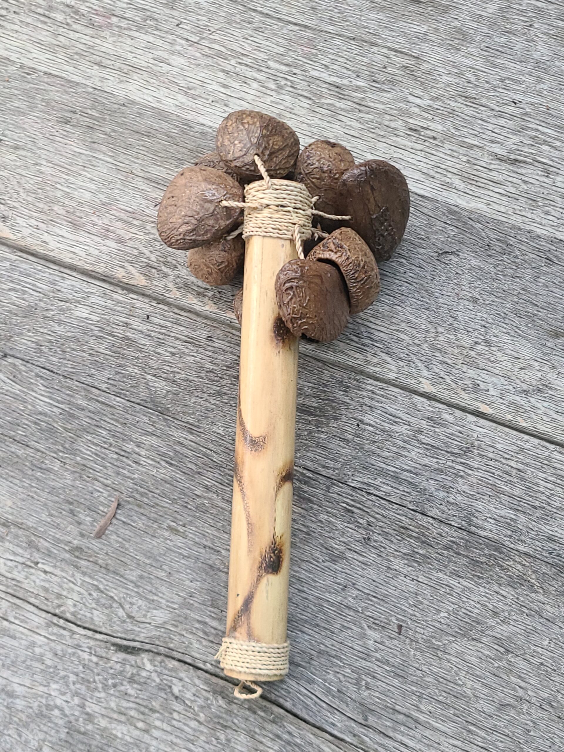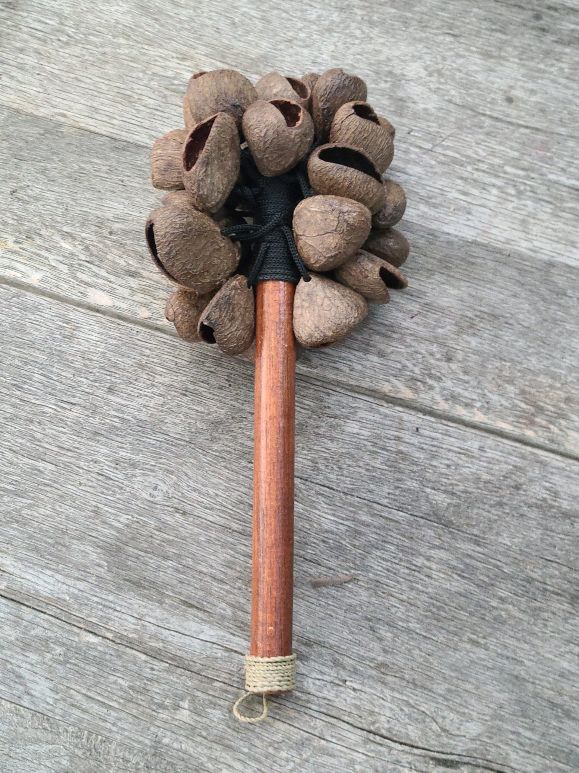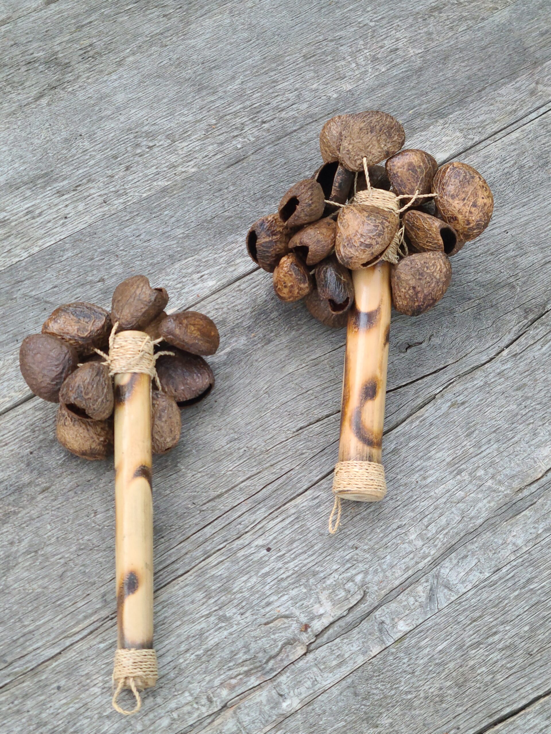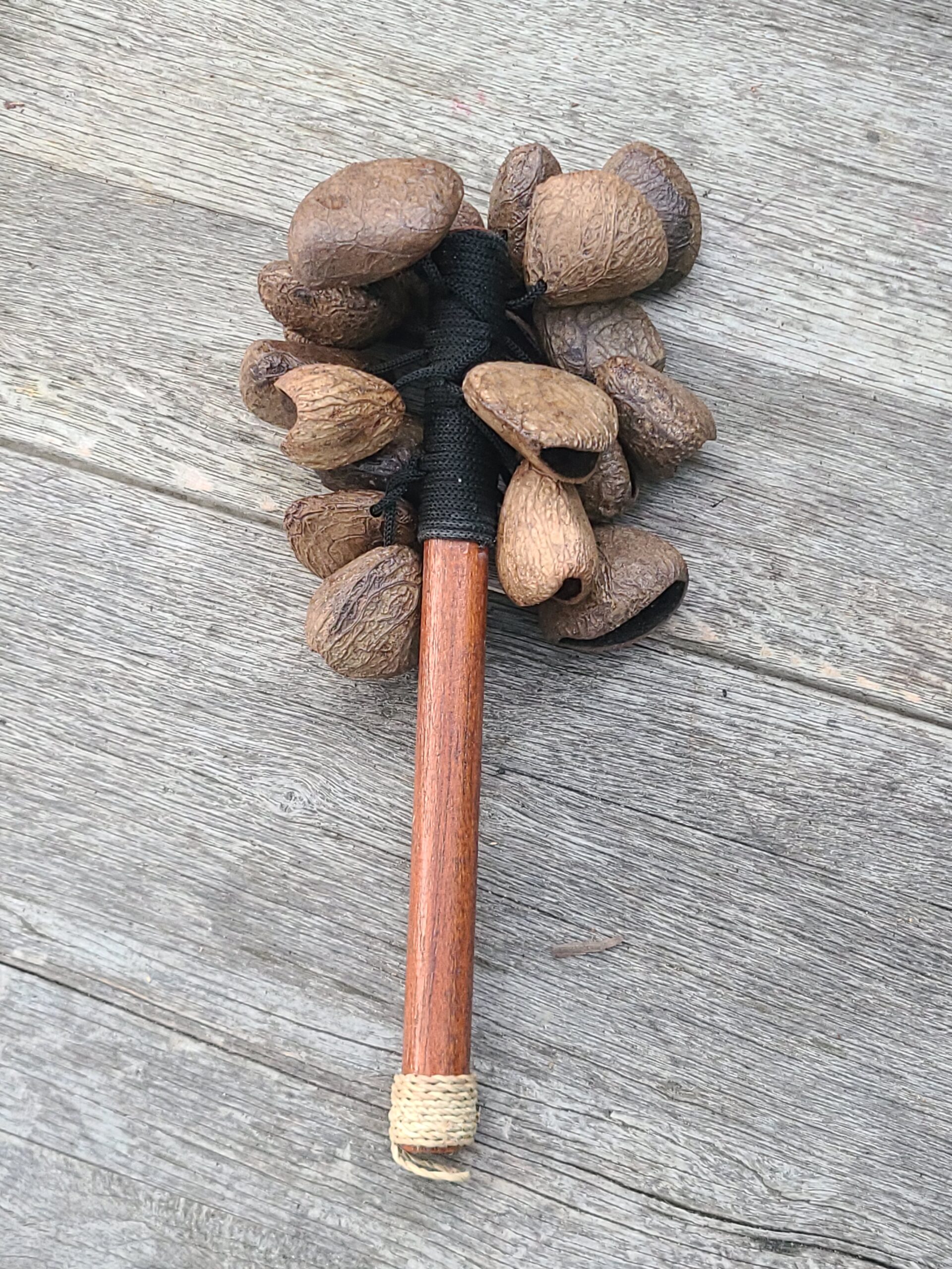 Kluwak or pangi is a tall tree native to the mangrove swamps of Southeast Asia. It produces a large fruit, the dried hard shell produces a watery medium musical sound. There are several options of how this seed is made into a musical instrument, choose from a hand held shaker or, a worn leg rattle.