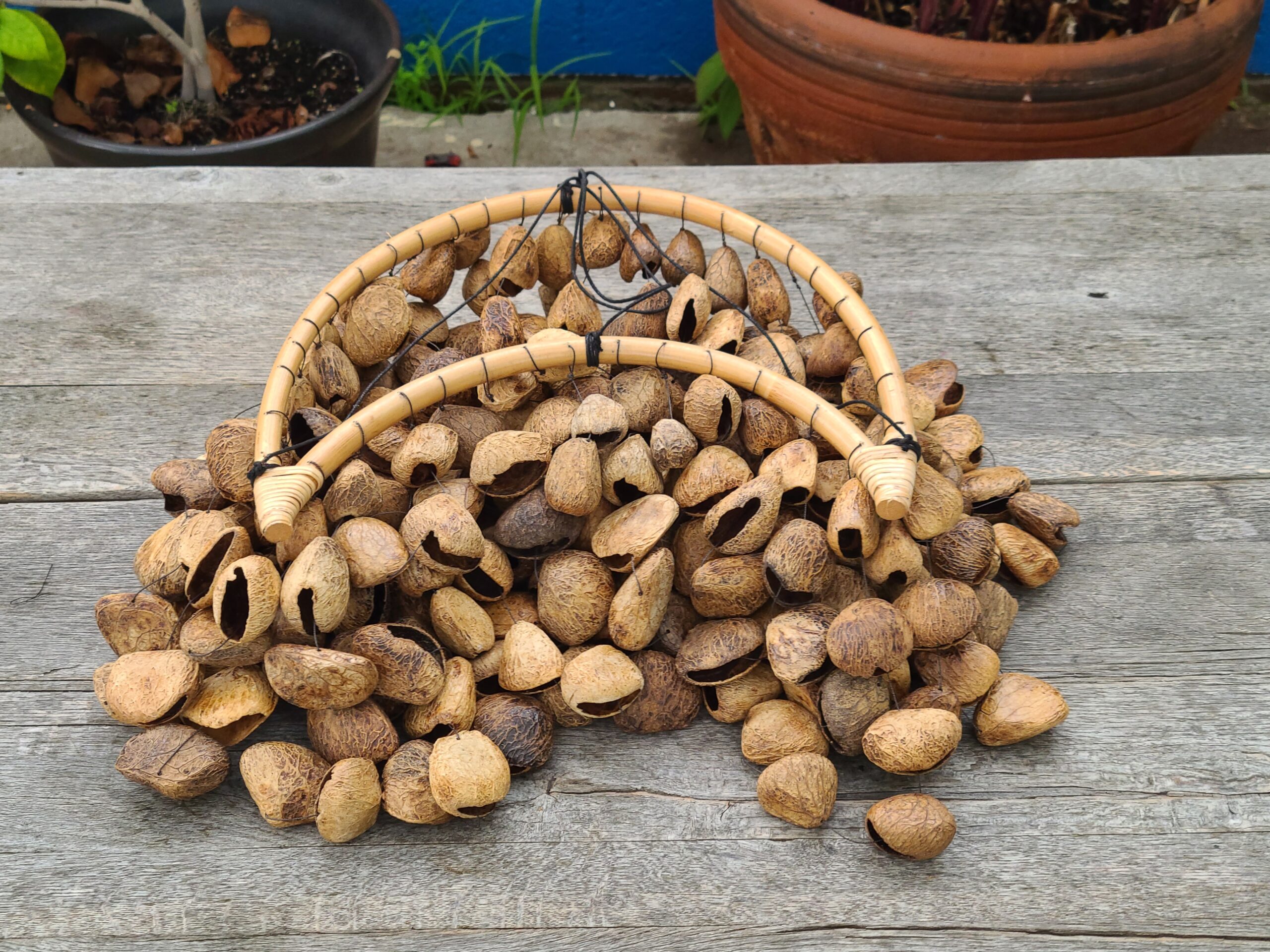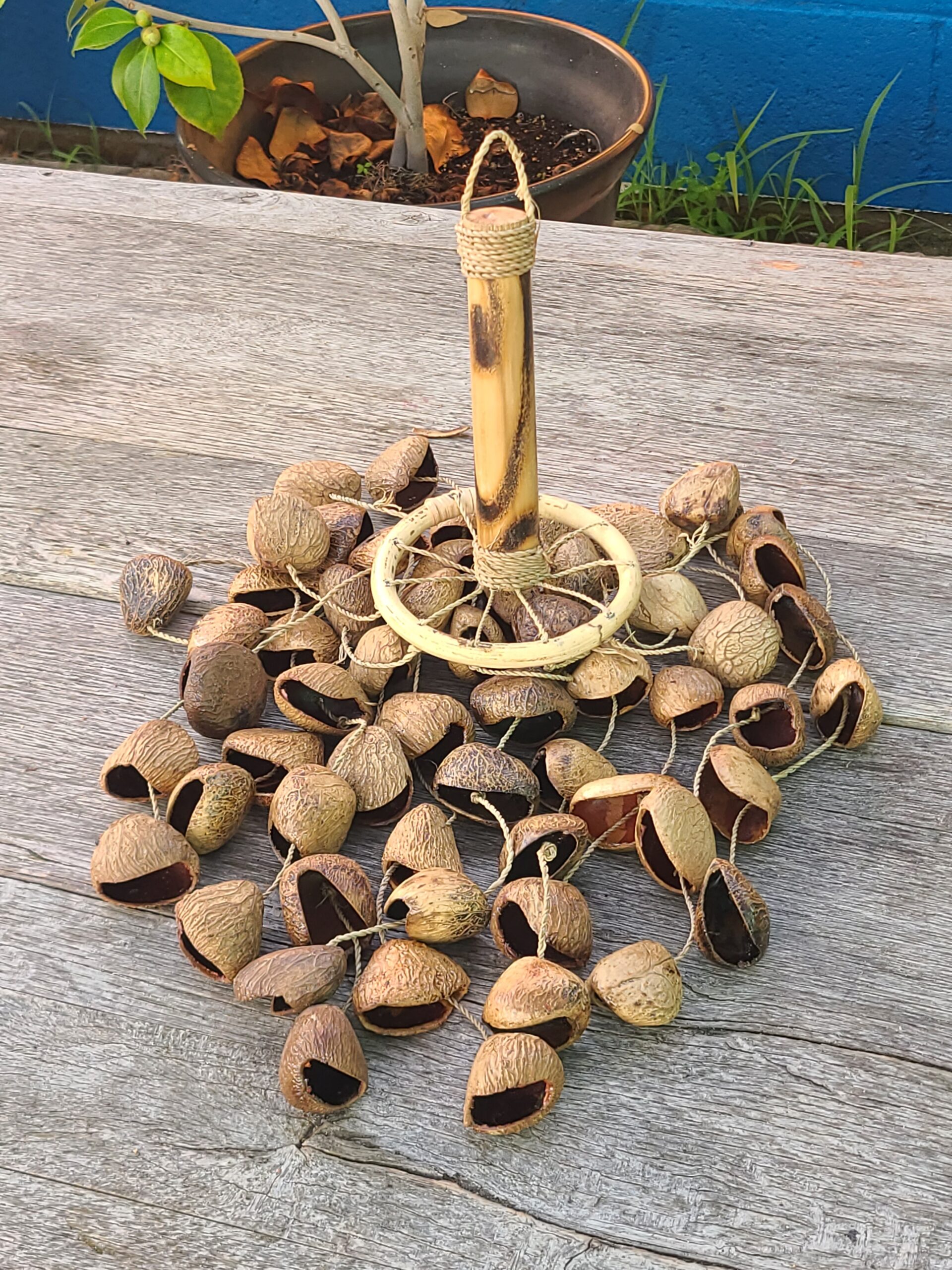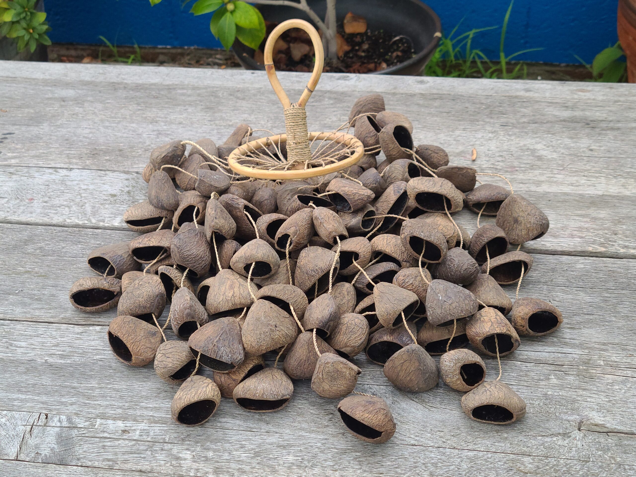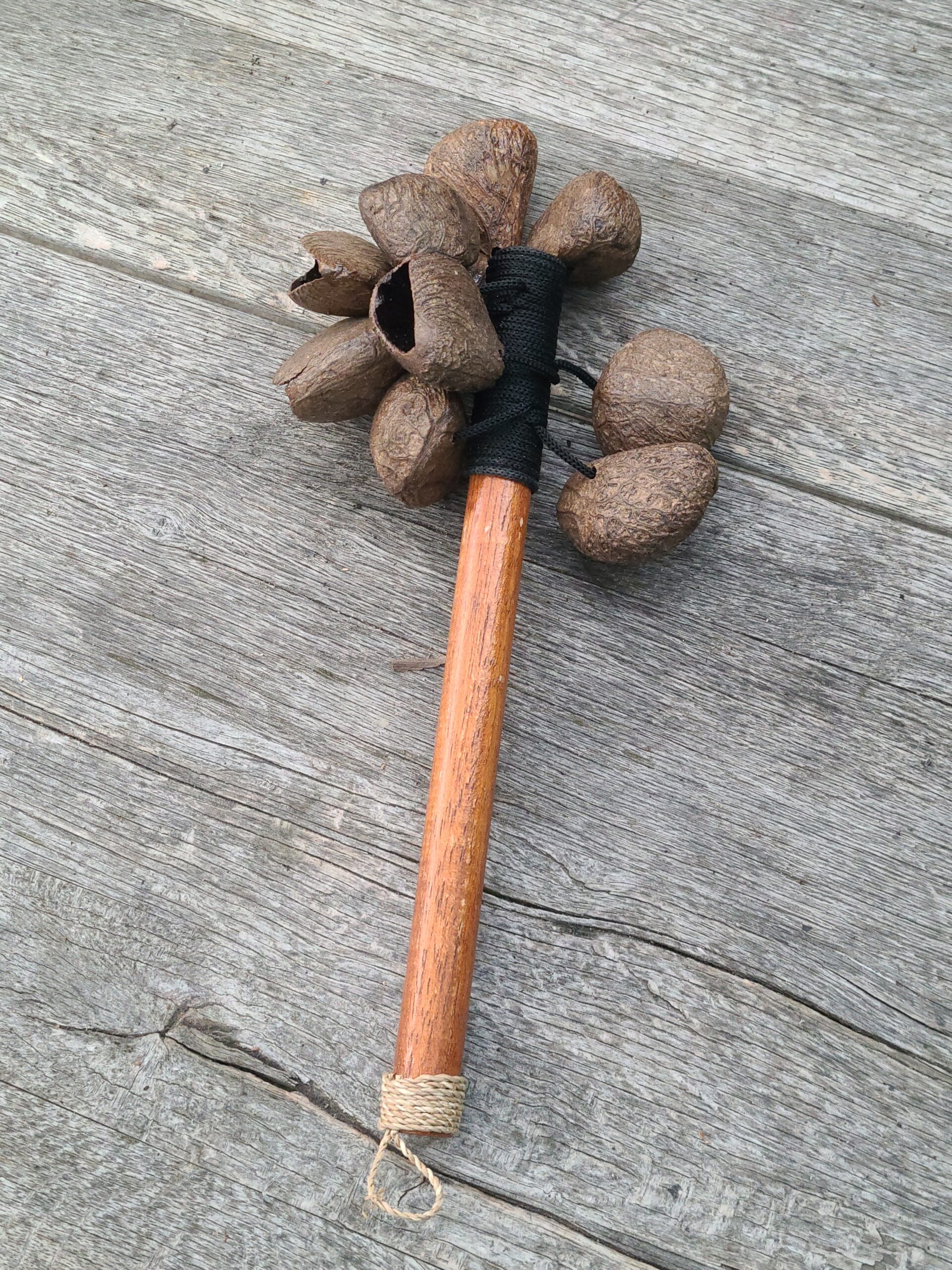 Kluwak or pangi is a tall tree native to the mangrove swamps of Southeast Asia. It produces a large fruit, the dried hard shell produces a watery medium musical sound. There are several options of how this seed is made into a musical instrument, choose from a hand held shaker or, a worn leg rattle.