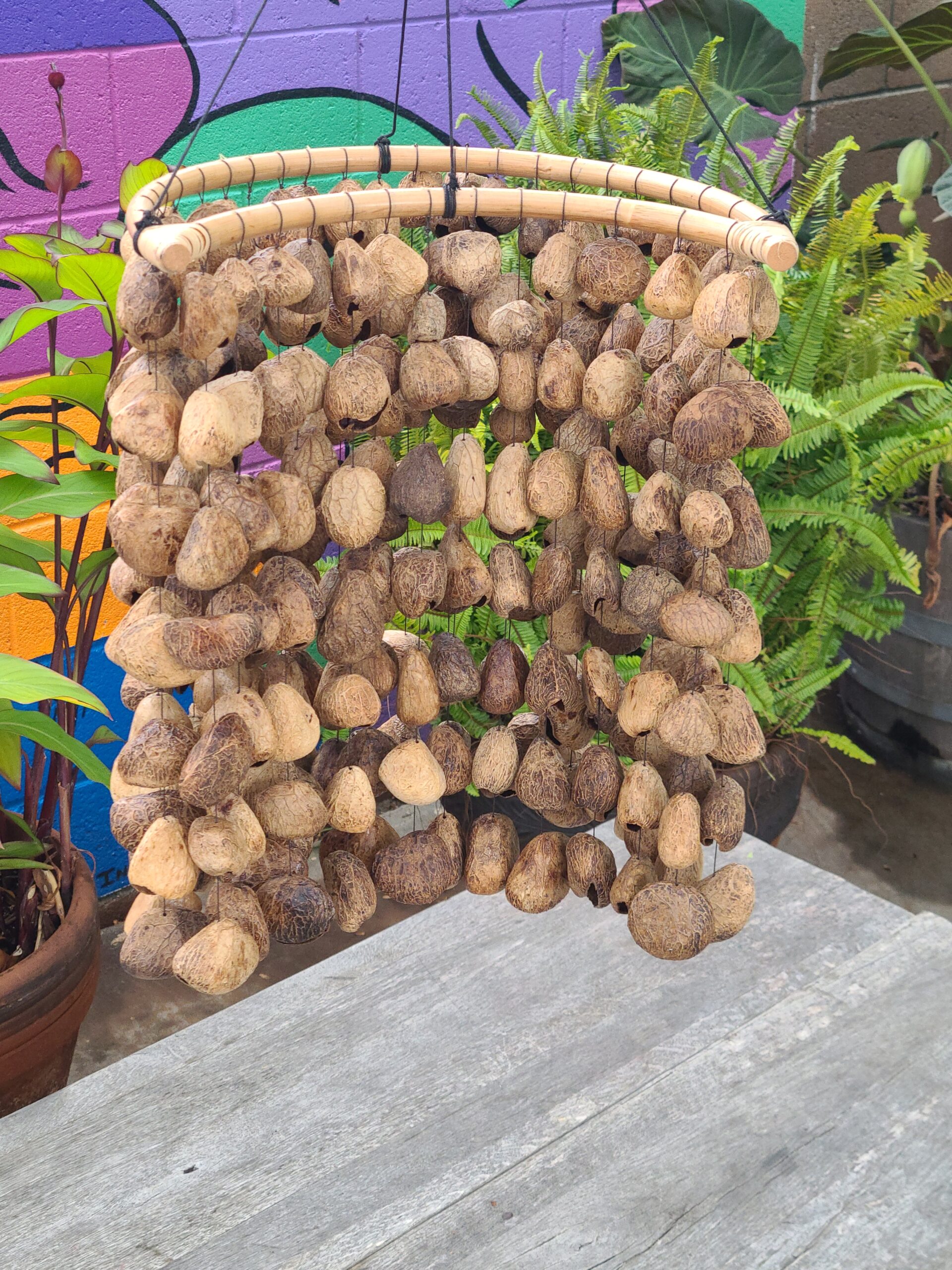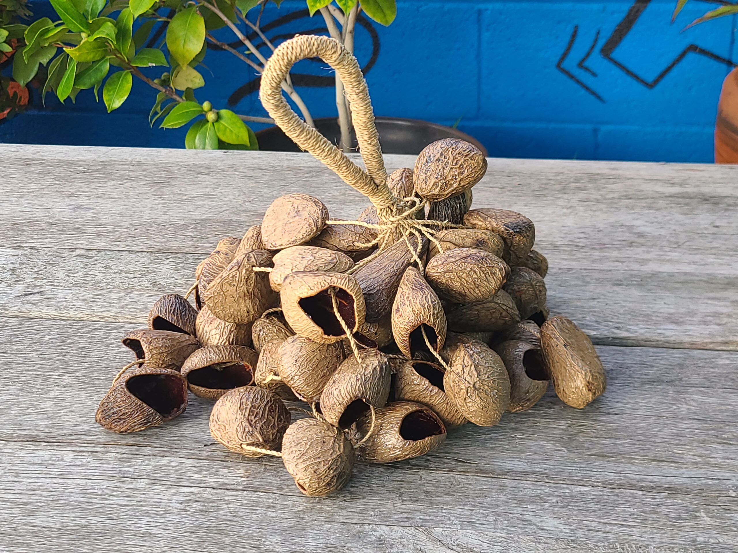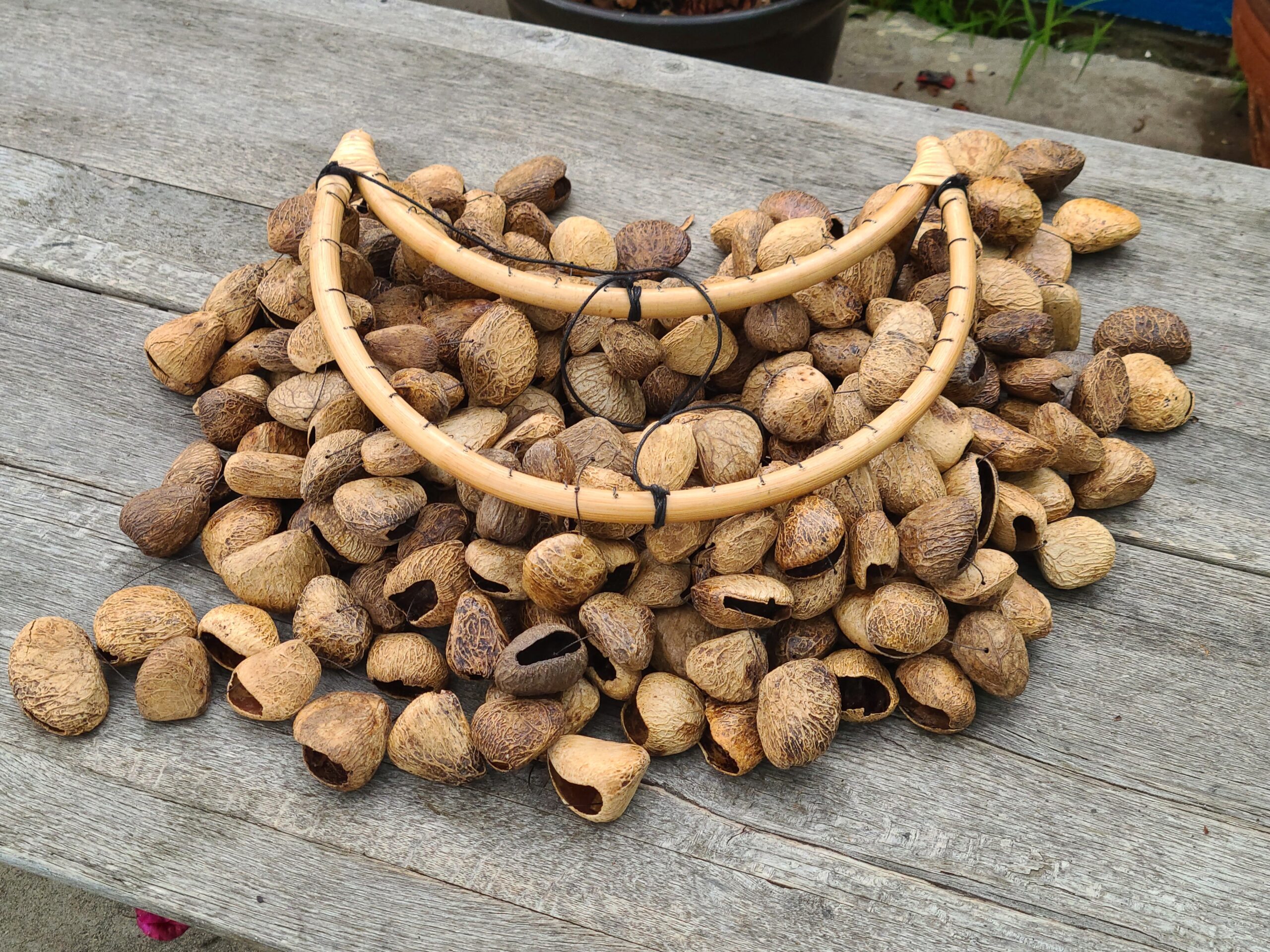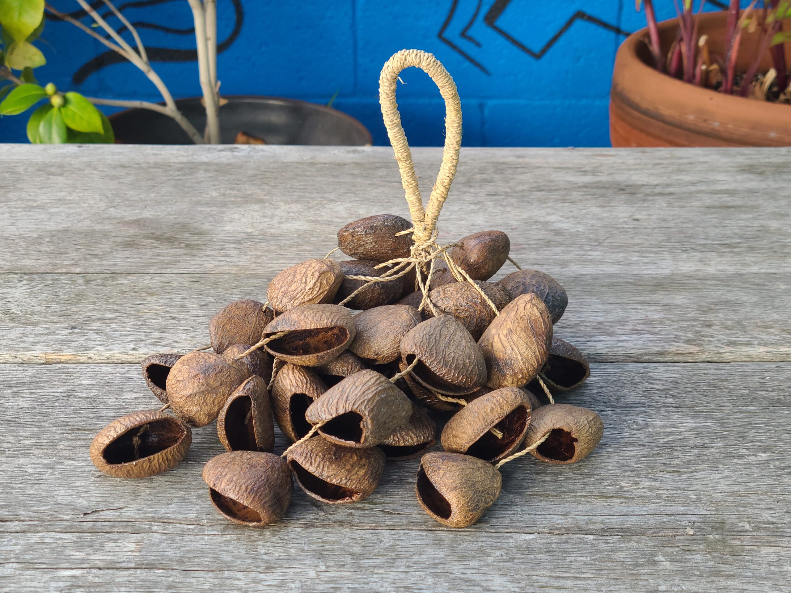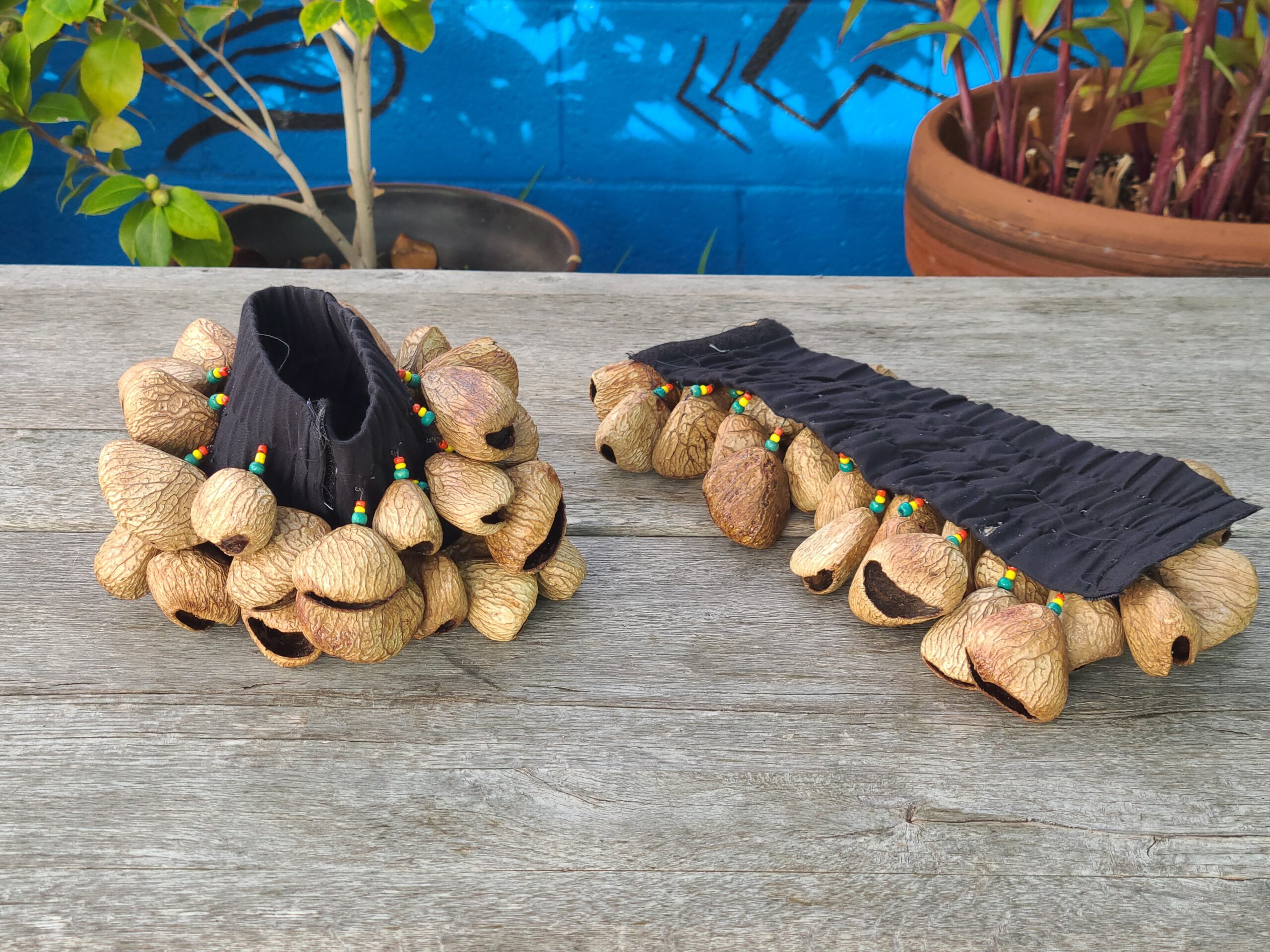 Kluwak or pangi is a tall tree native to the mangrove swamps of Southeast Asia. It produces a large fruit, the dried hard shell produces a watery medium musical sound. There are several options of how this seed is made into a musical instrument, choose from a hand held shaker or, a worn leg rattle.