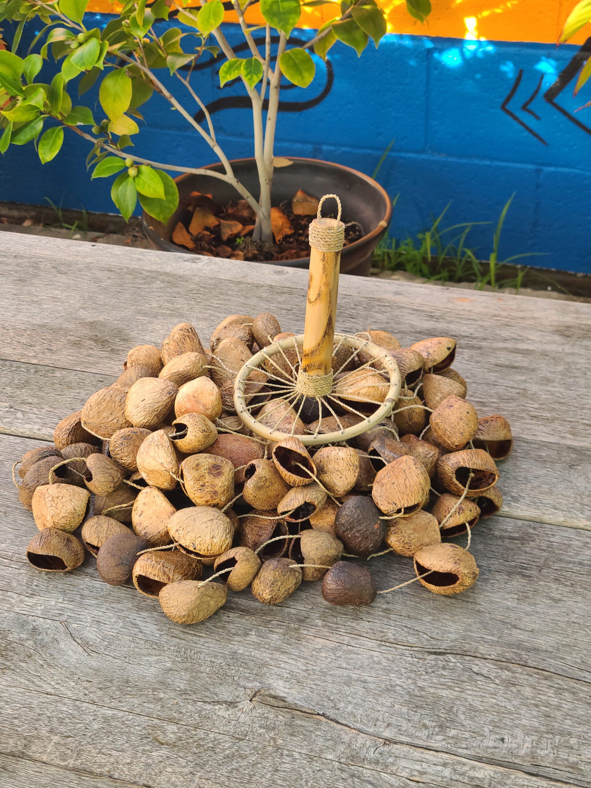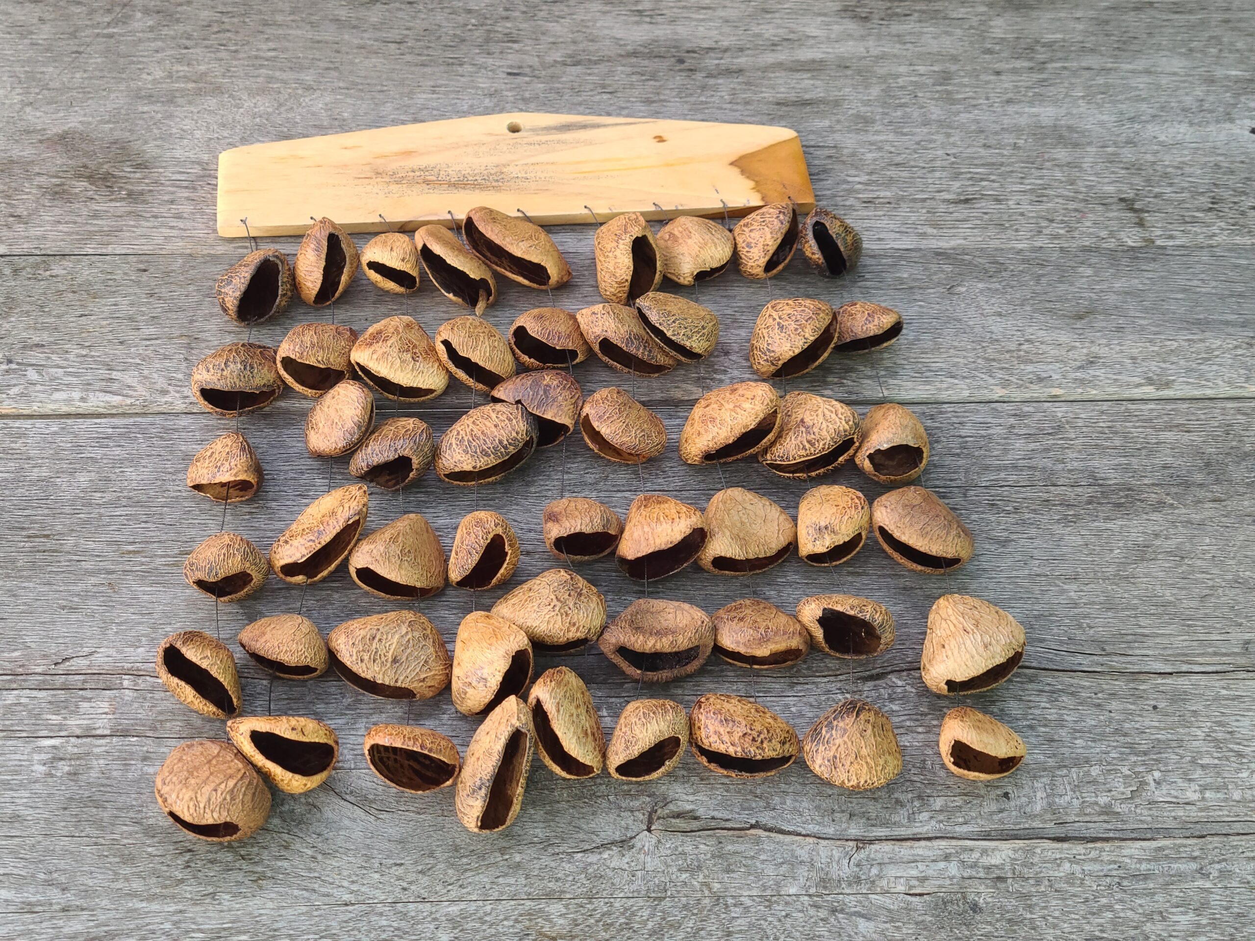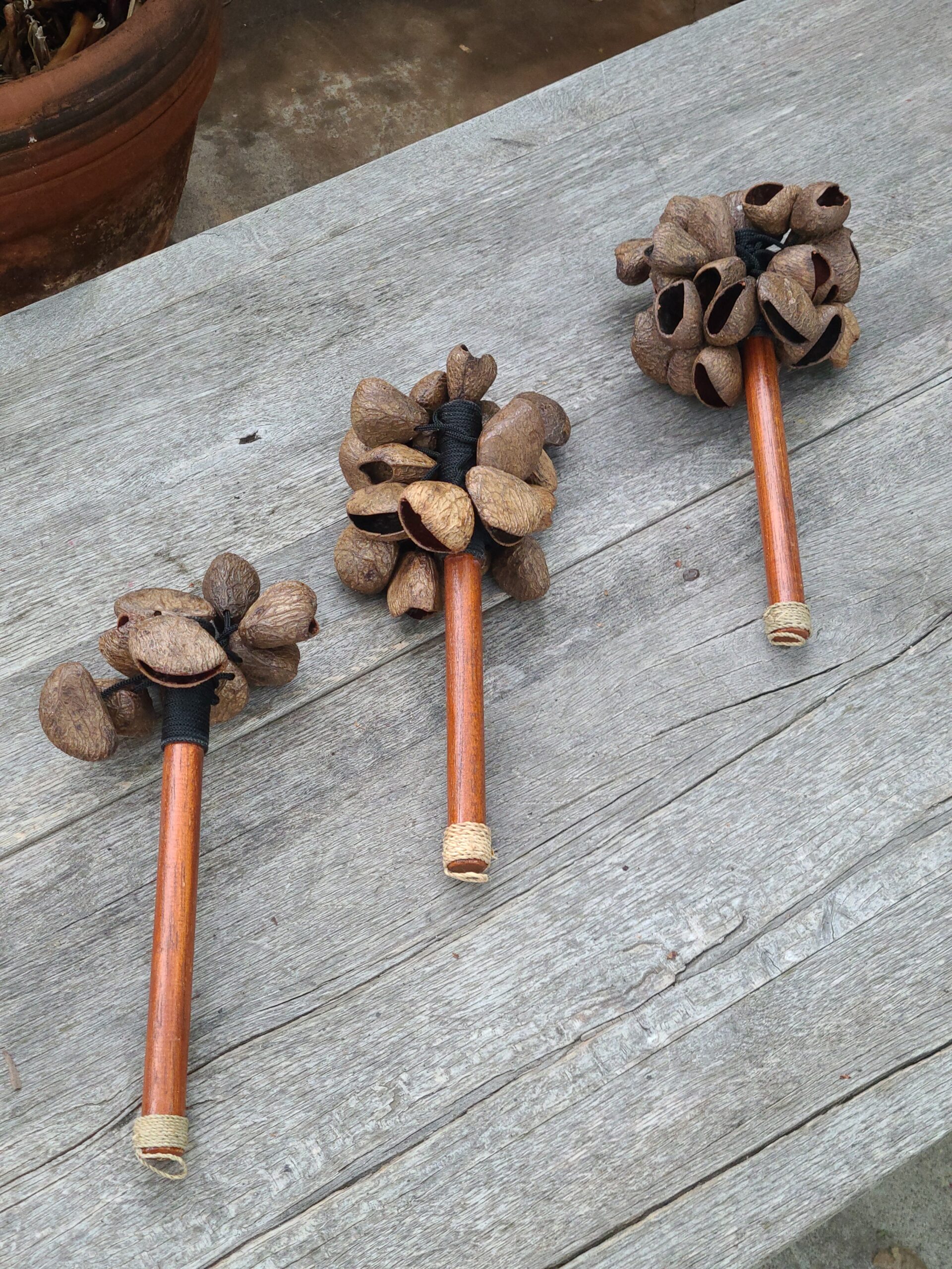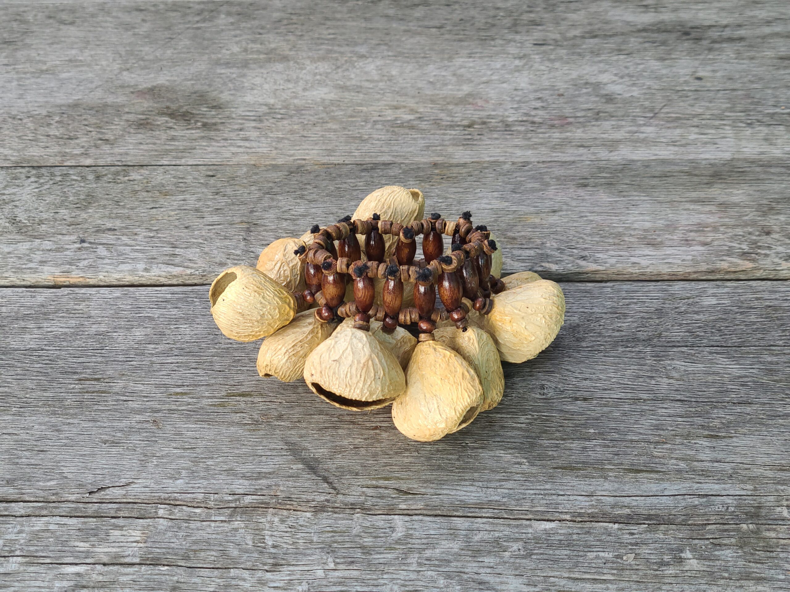 Kluwak or pangi is a tall tree native to the mangrove swamps of Southeast Asia. It produces a large fruit, the dried hard shell produces a watery medium musical sound. There are several options of how this seed is made into a musical instrument, choose from a hand held shaker or, a worn leg rattle.