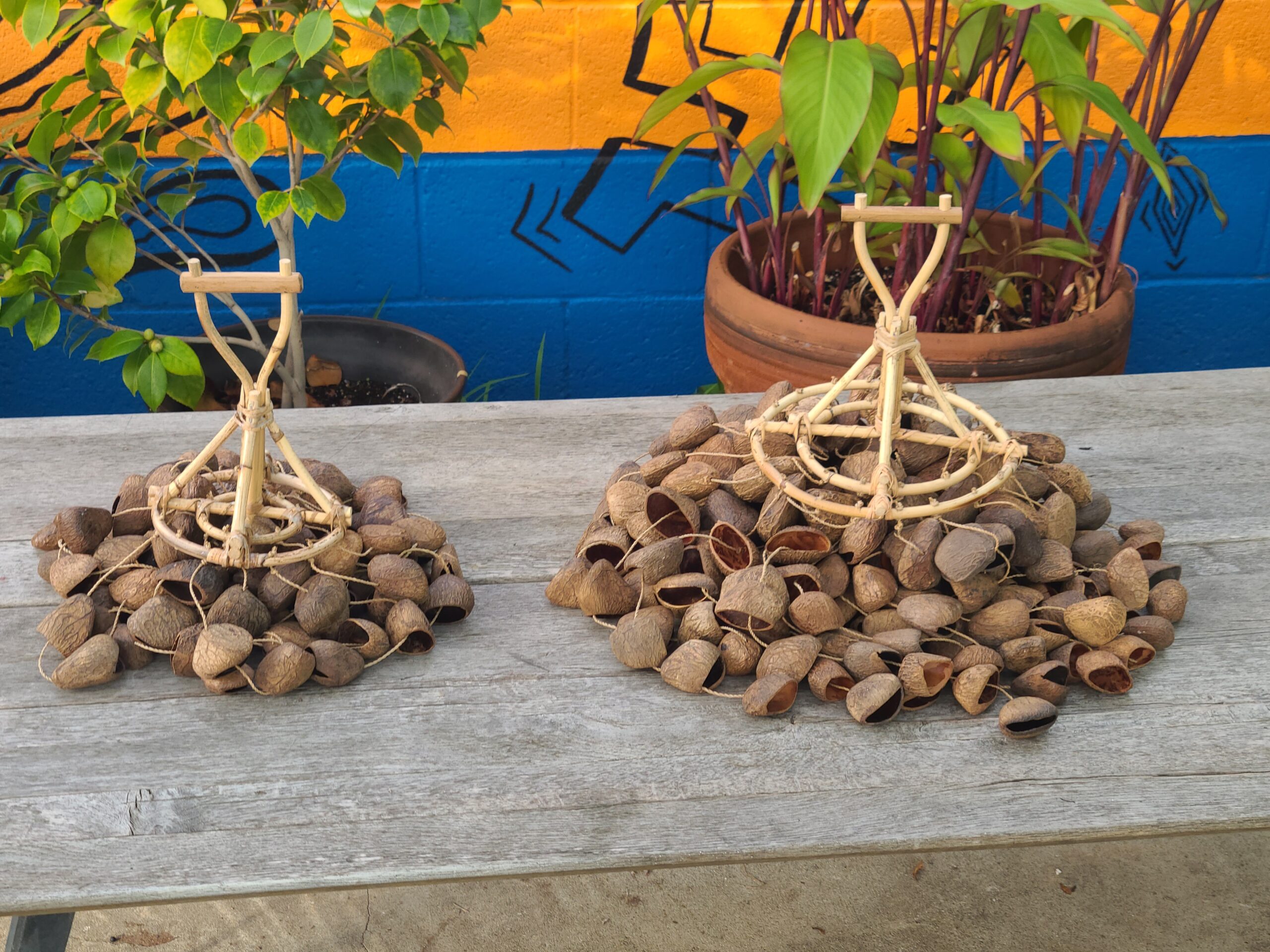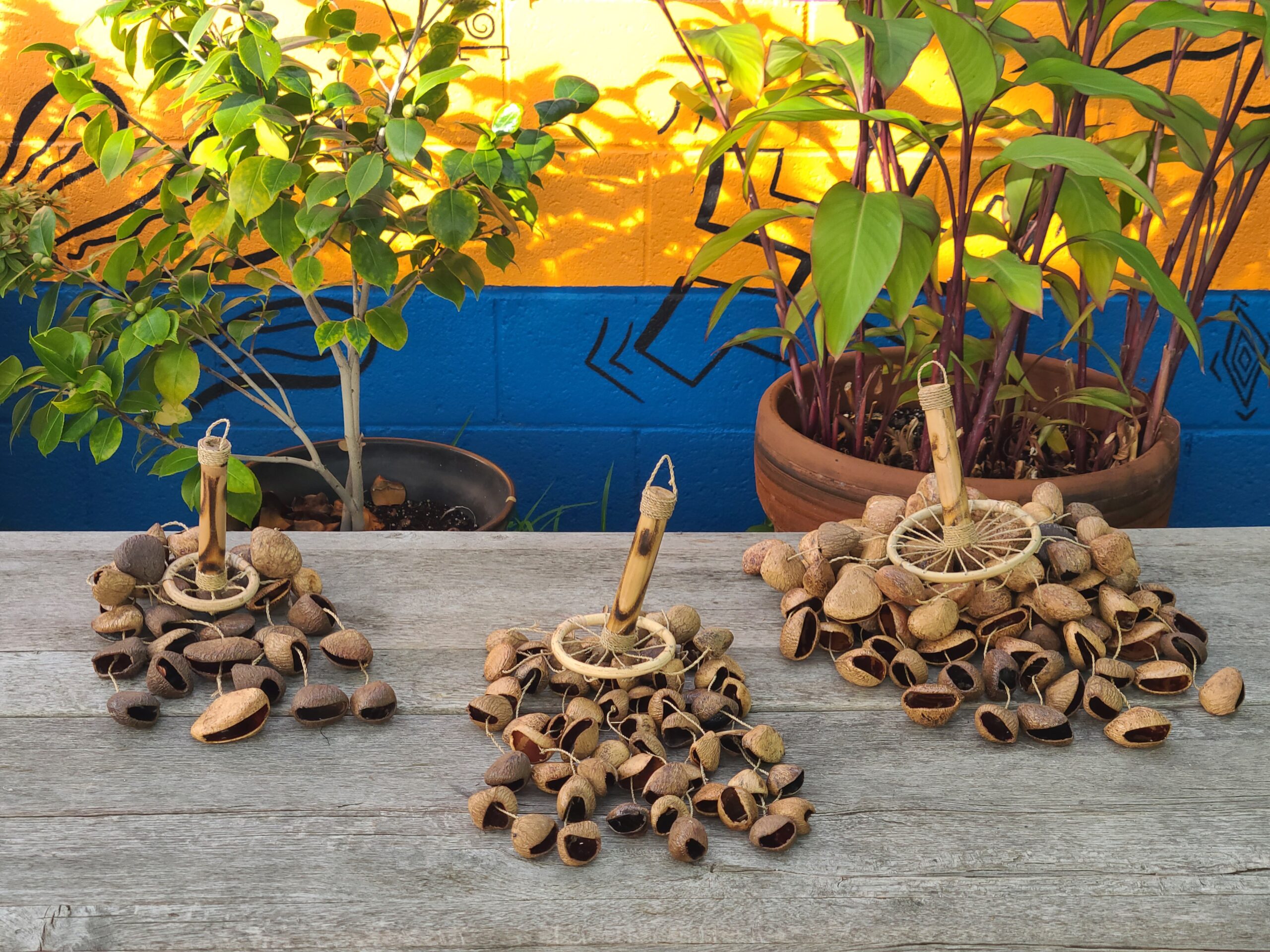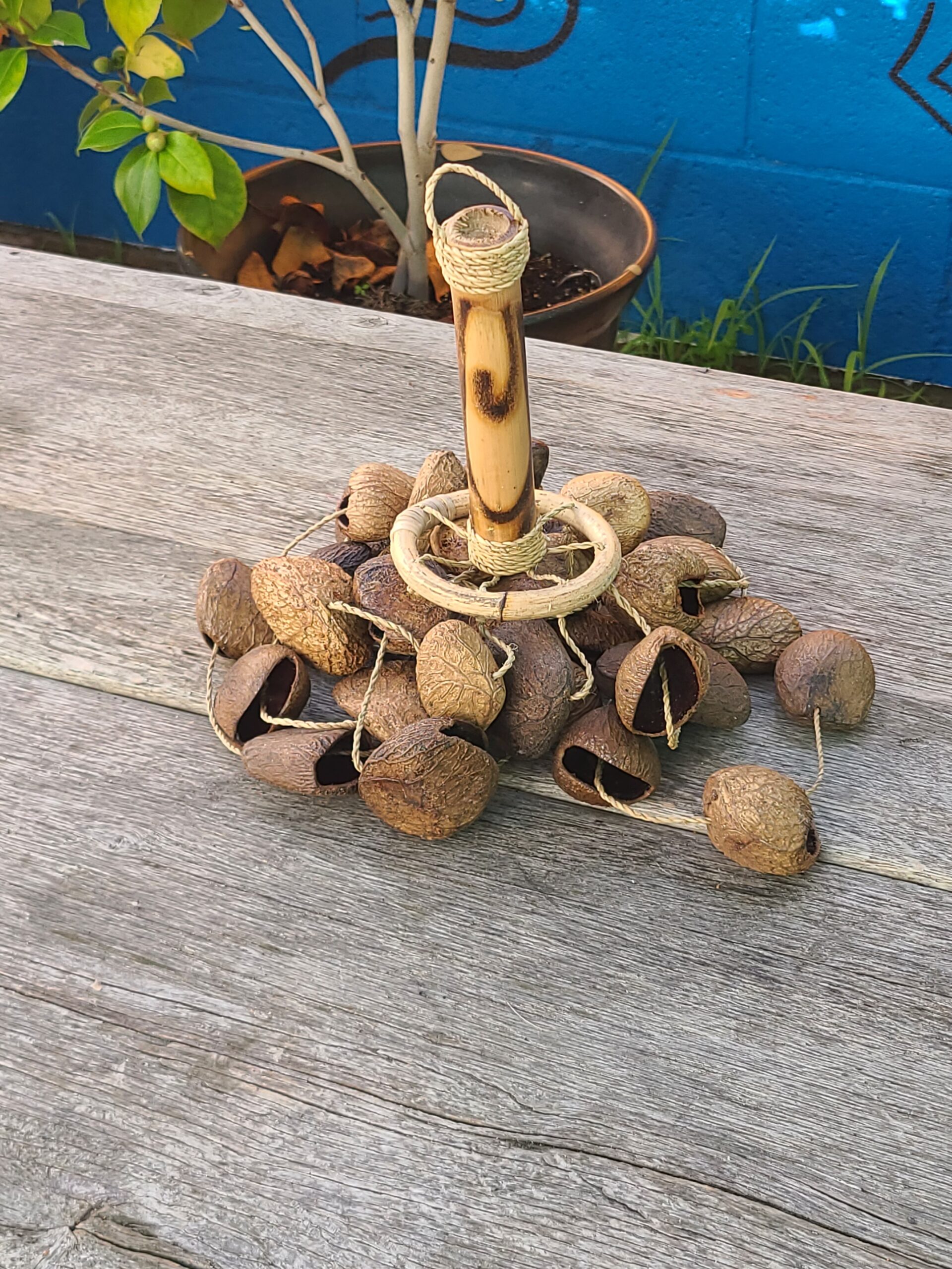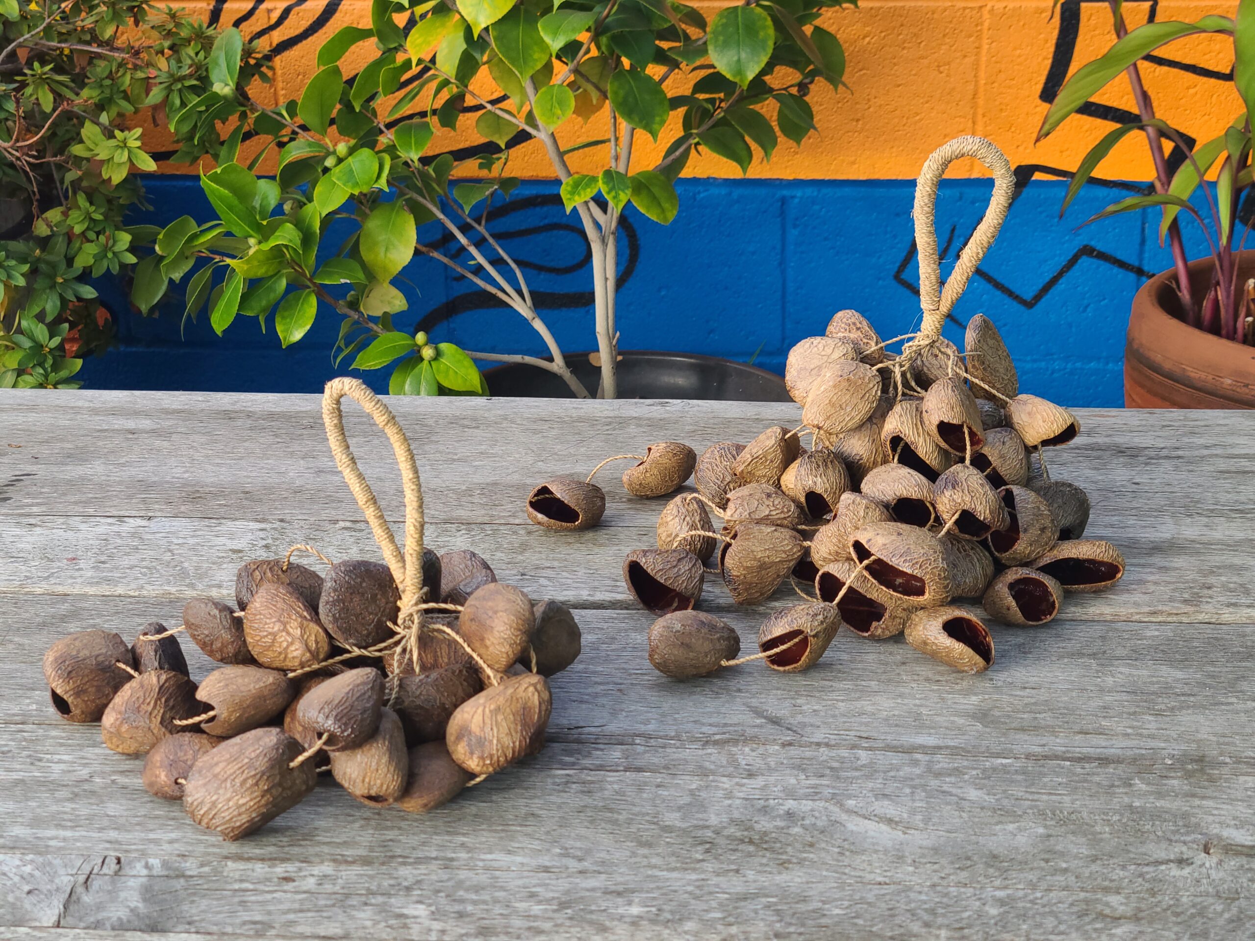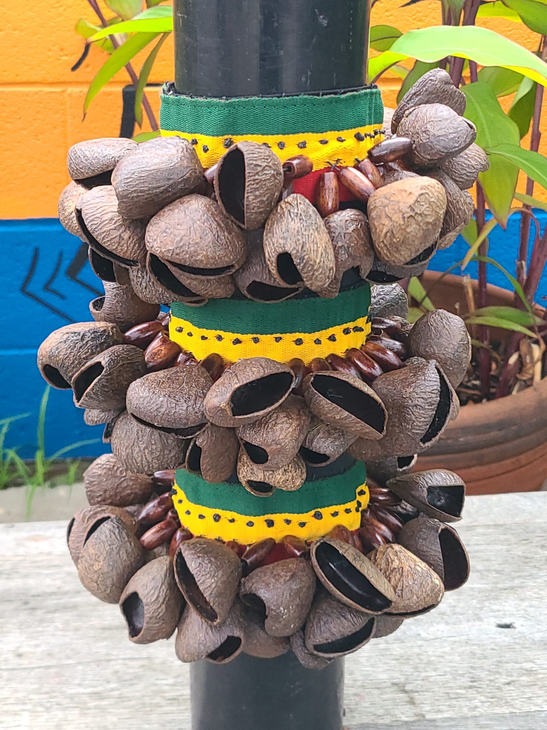 Kluwak or pangi is a tall tree native to the mangrove swamps of Southeast Asia. It produces a large fruit, the dried hard shell produces a watery medium musical sound. There are several options of how this seed is made into a musical instrument, choose from a hand held shaker or, a worn leg rattle.