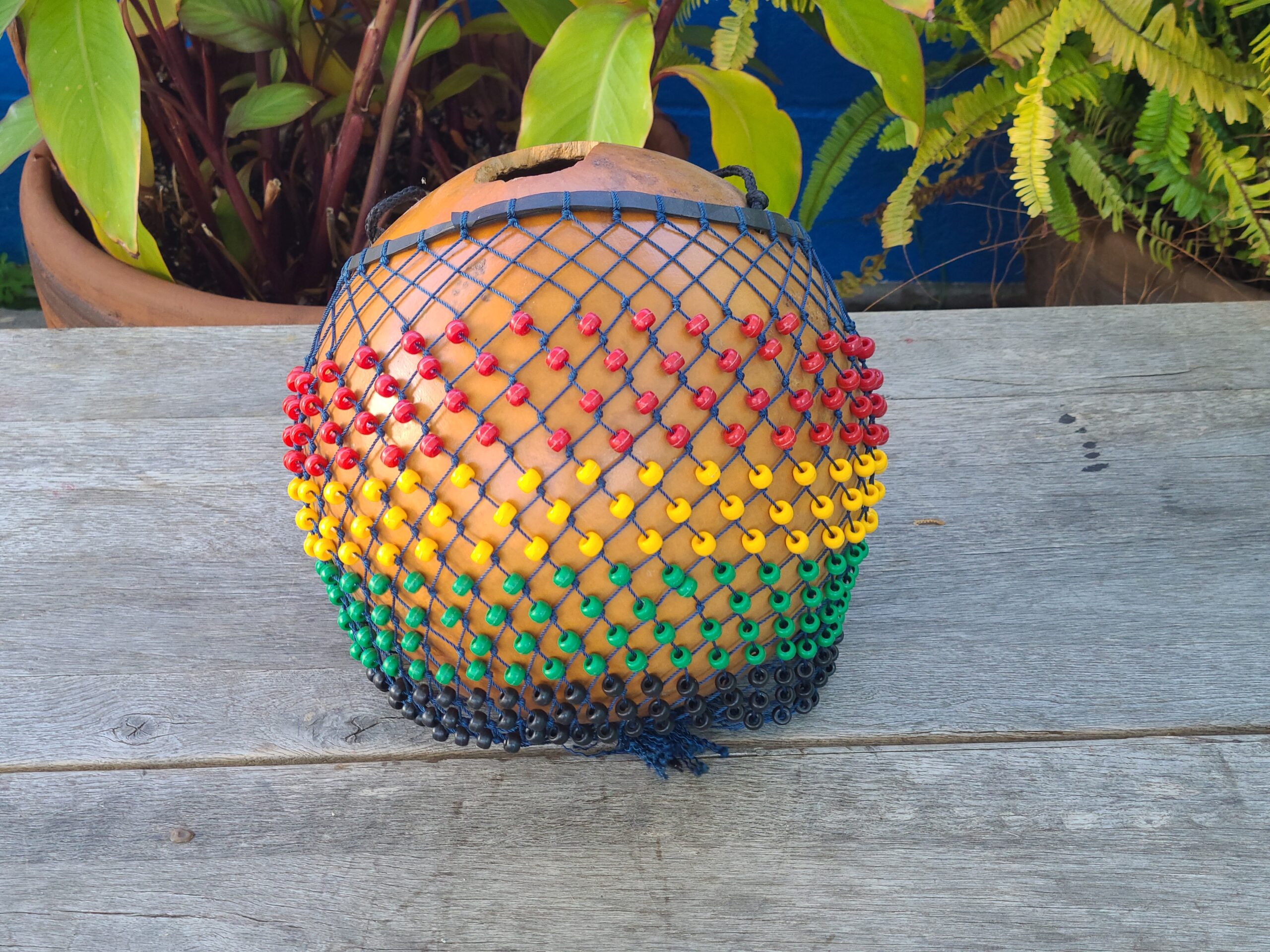The Nigerian “shekere” is the mother of all shakers, or at least is has influenced the sound or the construction of many current percussion shakers, and the shaker feel of many music genres. Motherland shekeres are made from carefully selected and prepared Nigerian grown gourds, then a net of cowry shells are made to cover it. Selecting the gourds takes some consideration for best sound and playability. Thin, strong and hard shelled gourds are the best, they are light weight to hold and play, and have a lively responsive sound.