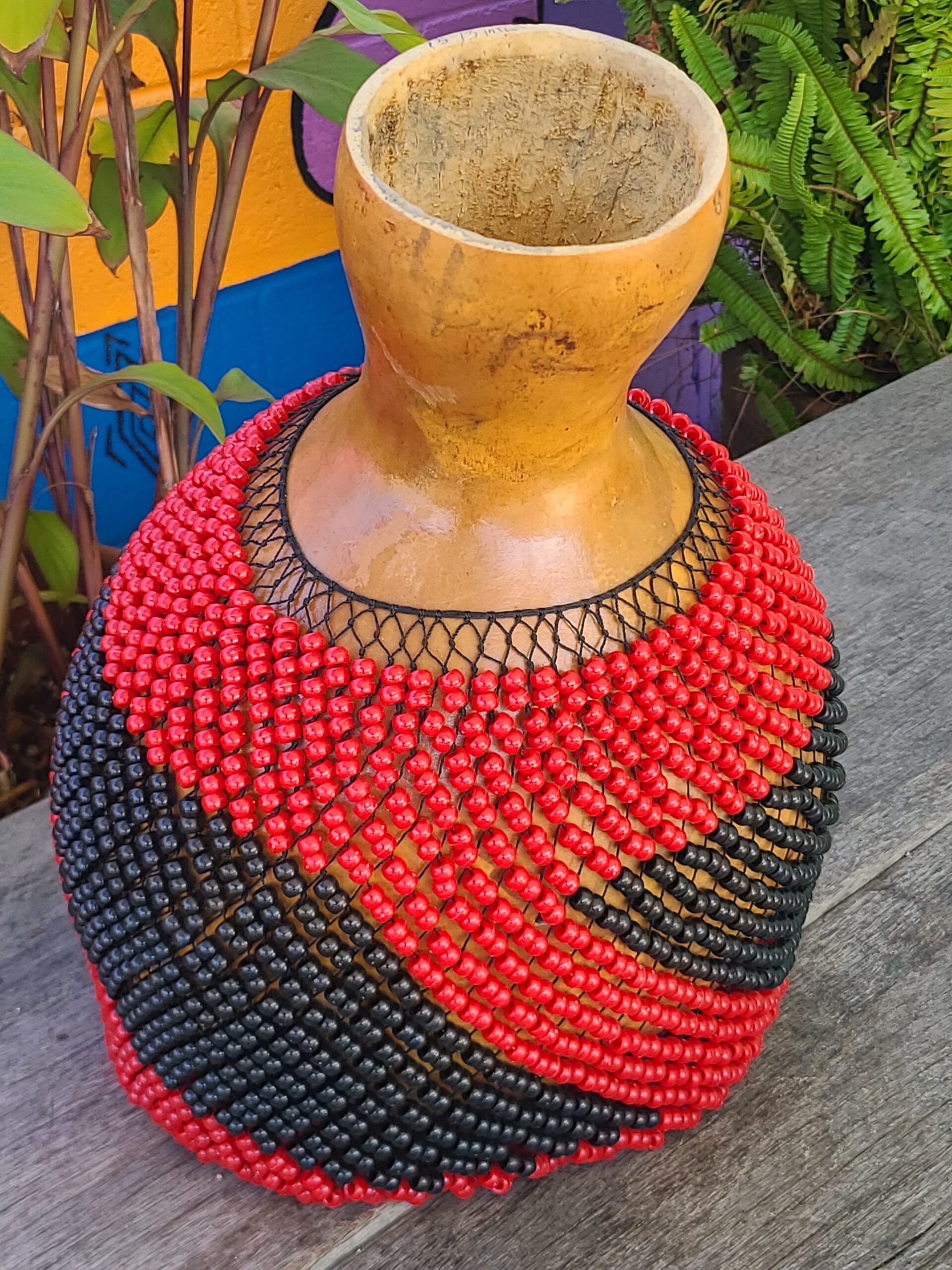 The Nigerian “shekere” is the mother of all shakers, or at least is has influenced the sound or the construction of many current percussion shakers, and the shaker feel of many music genres.  Motherland shekeres are made from carefully selected and prepared Nigerian grown gourds, then a net of beads are made to cover it. Selecting  the gourds takes some consideration for best sound and playability. Thin, strong and hard shelled gourds are the best, they are light weight to hold and play, and have a lively responsive sound. The shekere nets are strung with double the amount of beads than a standard one.