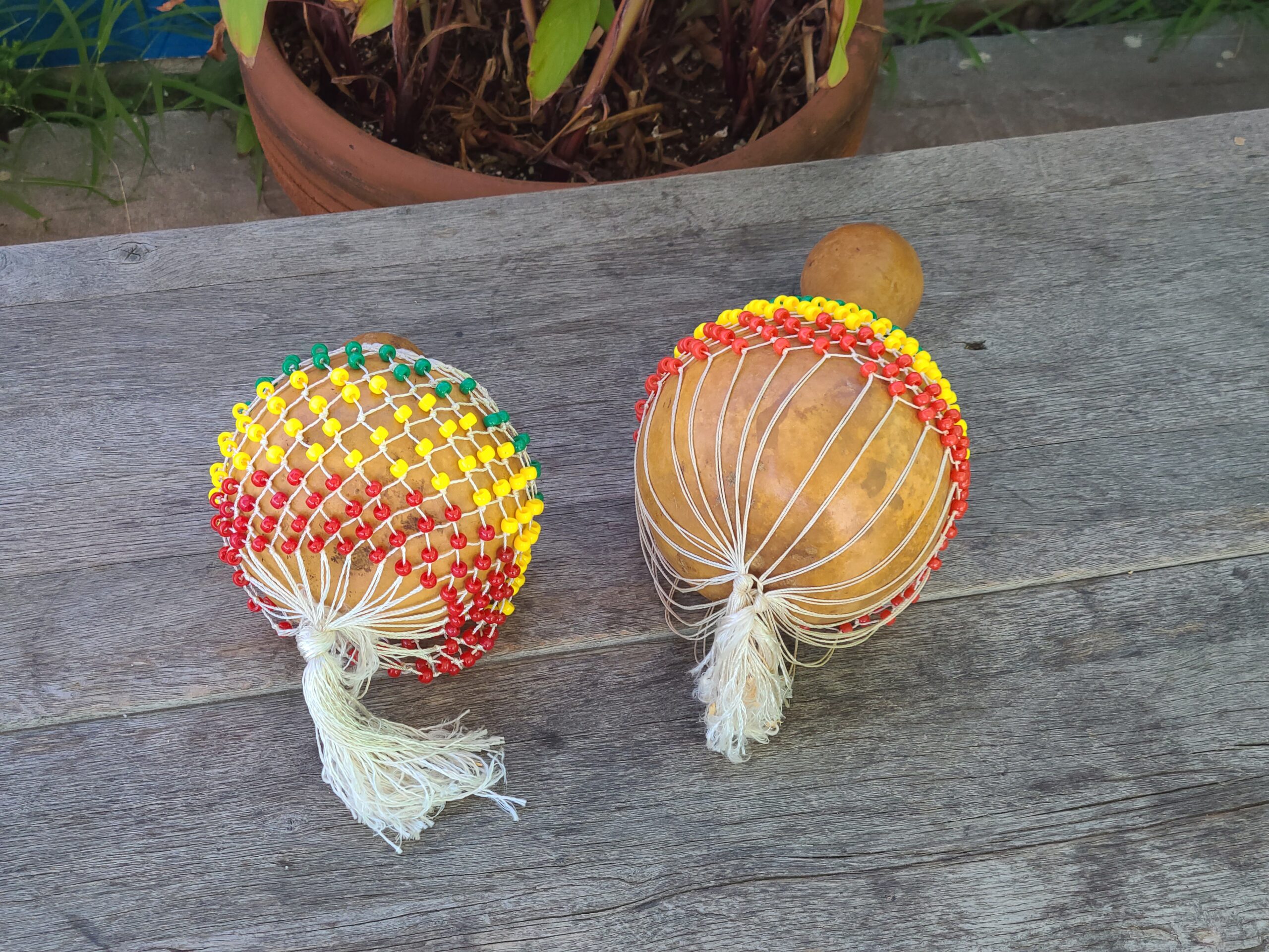 The Nigerian “shekere” is the mother of all shakers, or at least is has influenced the sound or the construction of many current percussion shakers, and the shaker feel of many music genres. Motherland shekeres are made from carefully selected and prepared Nigerian grown gourds, then a net of beads are made to cover it. Selecting the gourds takes some consideration for best sound and playability. Thin, strong and hard shelled gourds are the best, they are light weight to hold and play, and have a lively responsive sound. The shekere nets are strung with either a regular amount of beads or with extra ones. Smallest to xl-sizes are usually available but check stock quantities while ordering.