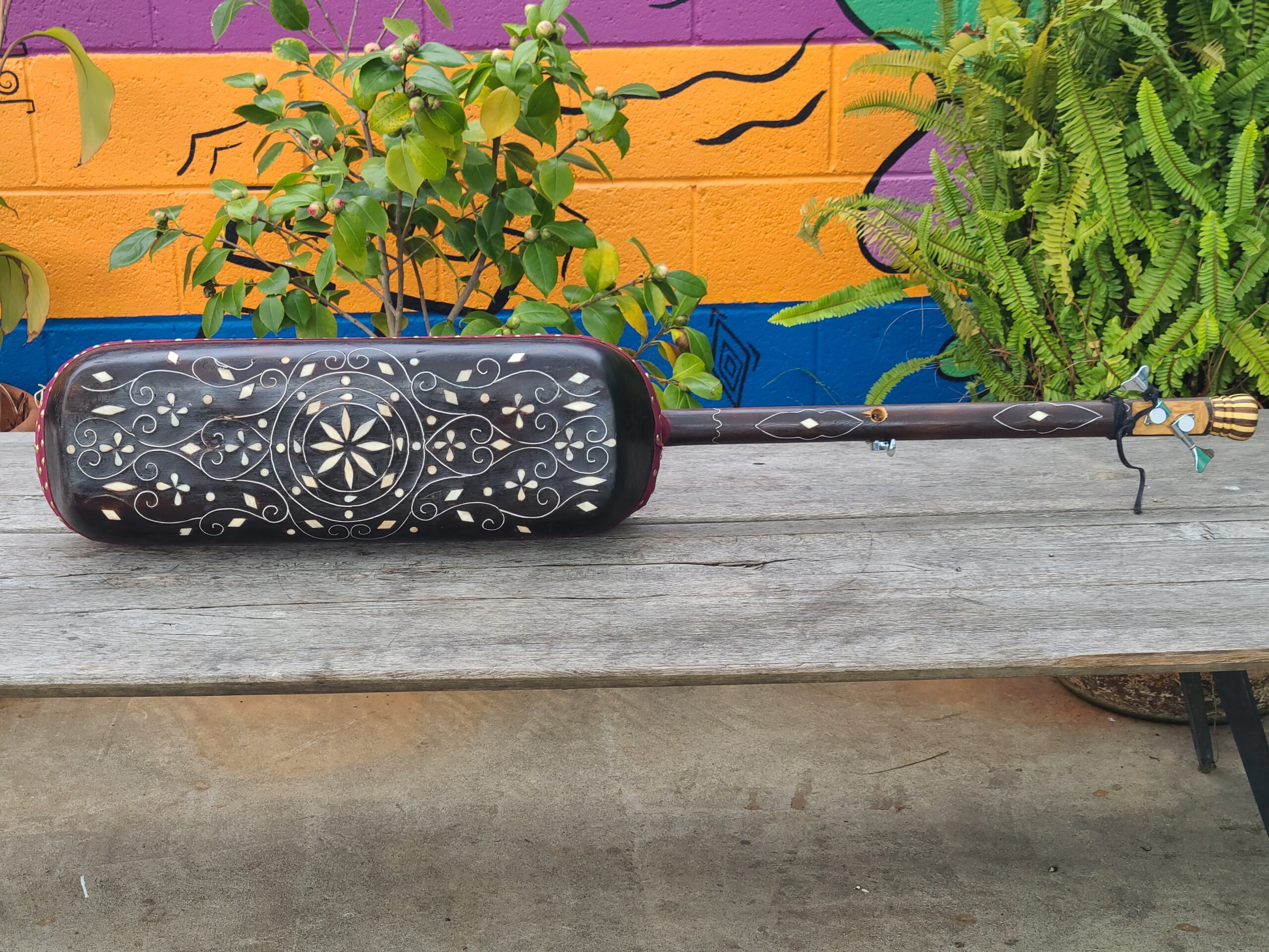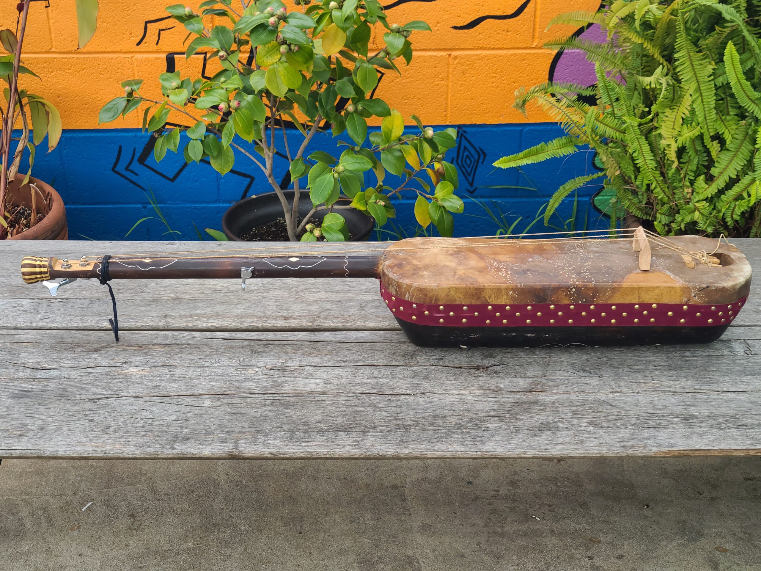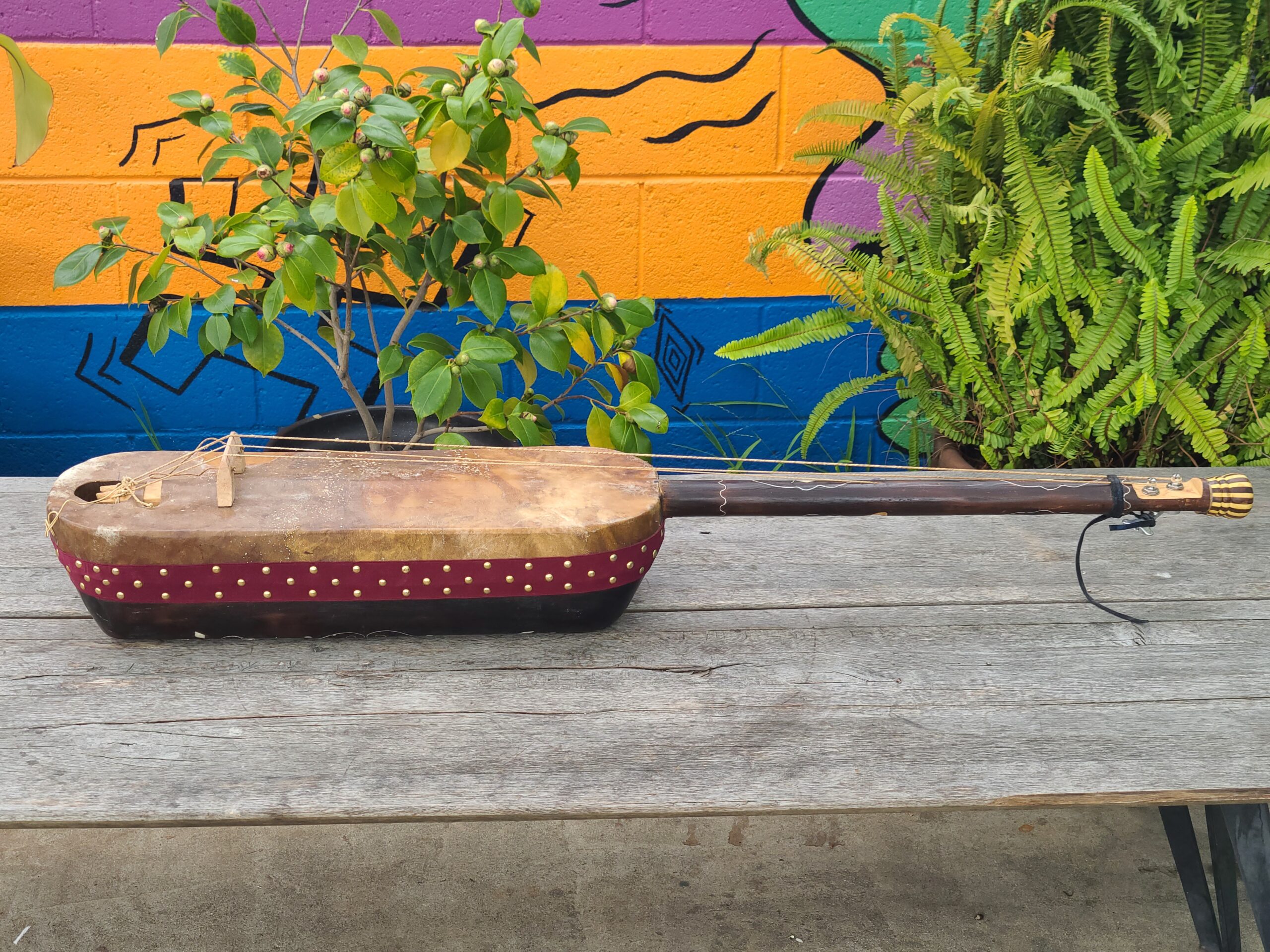 The Gimbre is a three stringed instrument that is a significant part of the Gnawa music tradition. The rectangular body is strung with three goat gut strings. The Gimbre is played bystriking the skin with the knuckles of the right hand and plucking the strings with the thumb and index finger. This technique produces a percussive bass like tone.
