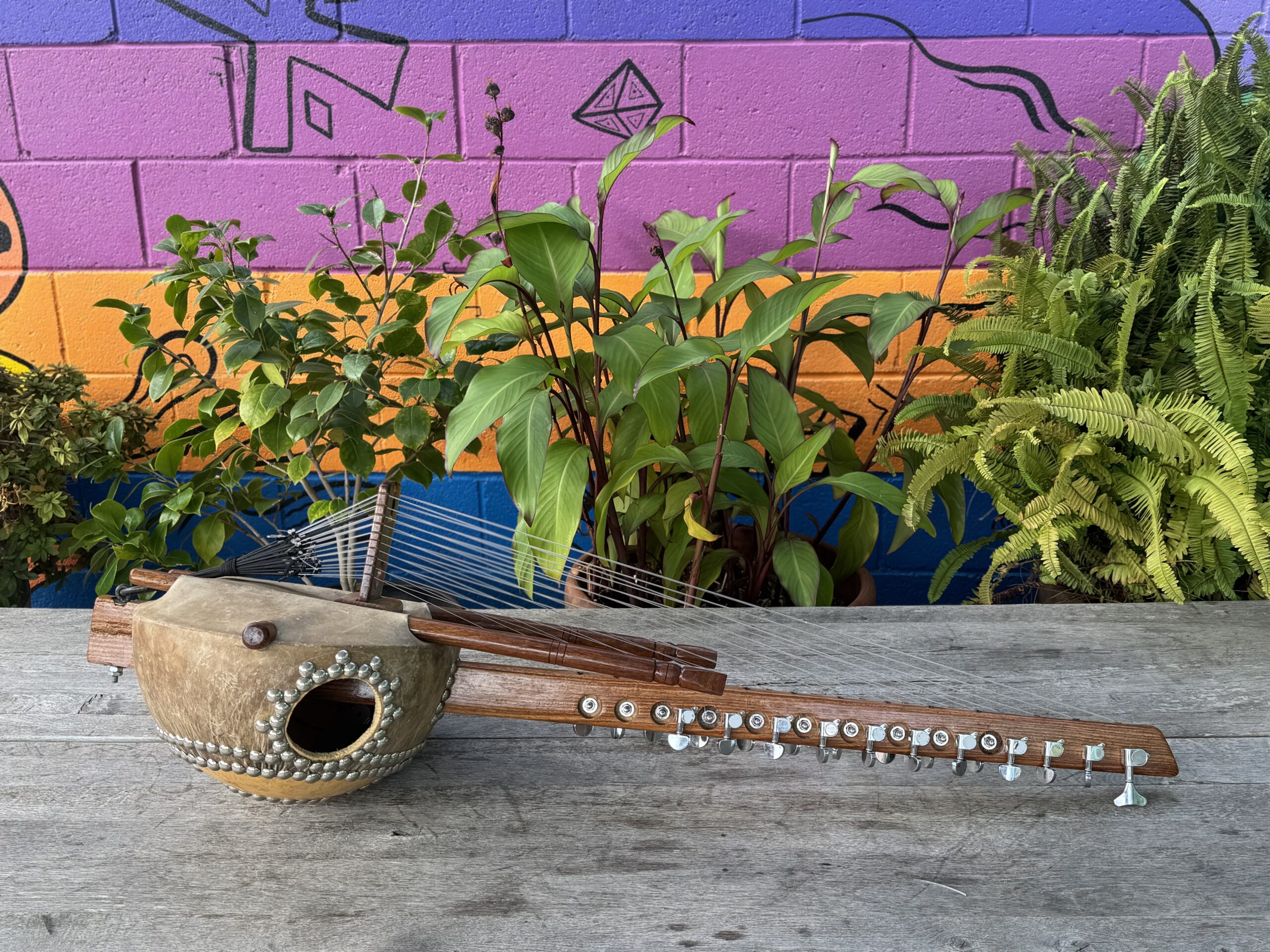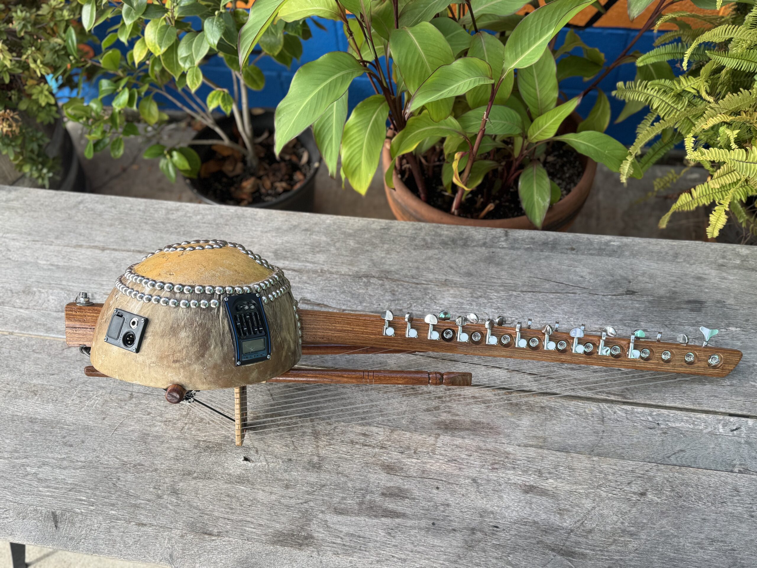 The kora is a harp-like West African instrument prevalent in several countries–Senegal, Guinea, and Ghana to name a few. It has 21 strings that are held in notches on a bridge called a bridge harp. The strings are tuned with four different heptatonic scales, giving the instrument plenty of dynamic range. Some come with a pickup installed to enable electronic amplification. Made from a gourd and covered with a skin, it is held by two handles and played by the thumb and index finger of each hand.